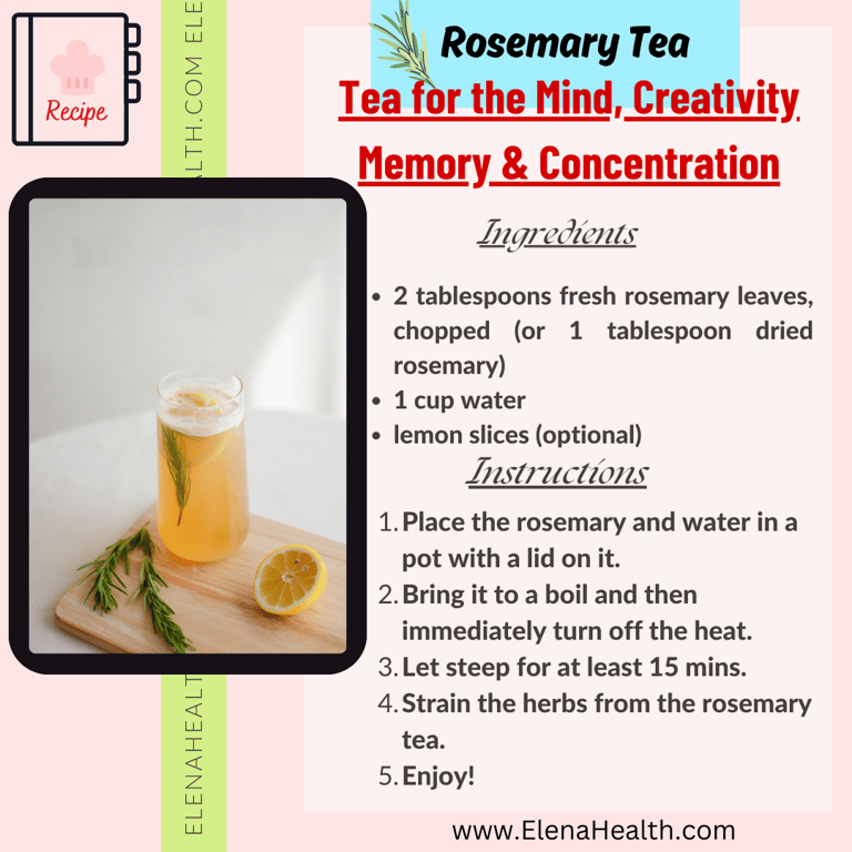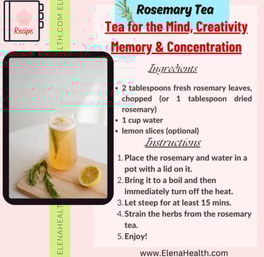 In ancient times, rosemary tea was used to treat various health problems from hair loss to digestive problems. And there is now compelling evidence that consuming and inhaling rosemary's compounds reduce anxiety, improve mood, concentration and memory. А key component of the herb, called 1,8-cineole (sin-ee-OLE), is detected in the bloodstream as soon as a person breathes in rosemary's aroma.